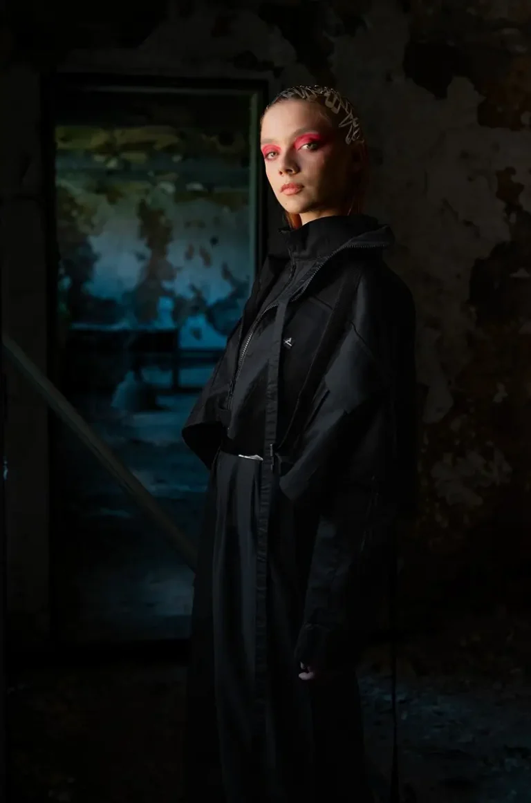 211,00 €The quilted hooded CONTRAPUNCT scarf exemplifies futuristic design principles, featuring a black cotton exterior with white topstitches and a quilted black cotton interior for added warmth and comfort. The design includes two front welt pockets with zips and a black rib tape positioned at the waist, enhancing both functionality and […]