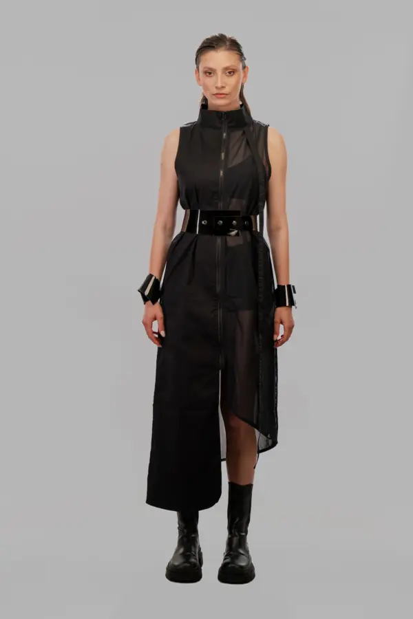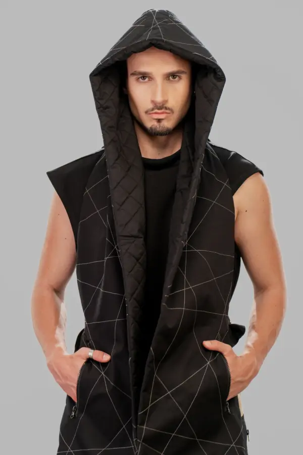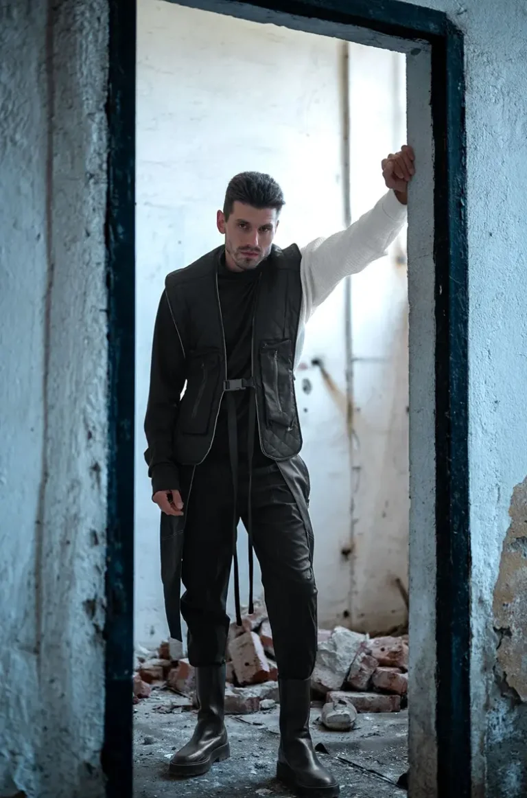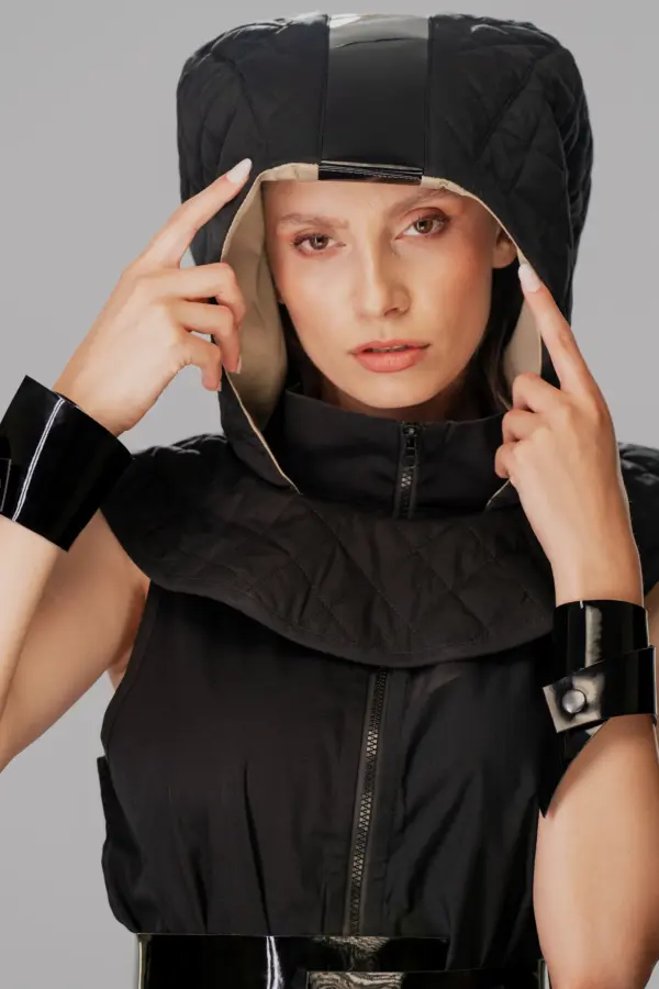 211,00 €The CONTRAPUNCT asymmetric vinyl panel vest is a statement piece that fuses material contrast with architectural form. The body is constructed from a light beige textured fabric. The interior is lined with black quilted cotton, providing both insulation and structural integrity. A wide collar adds ease of access and a […]