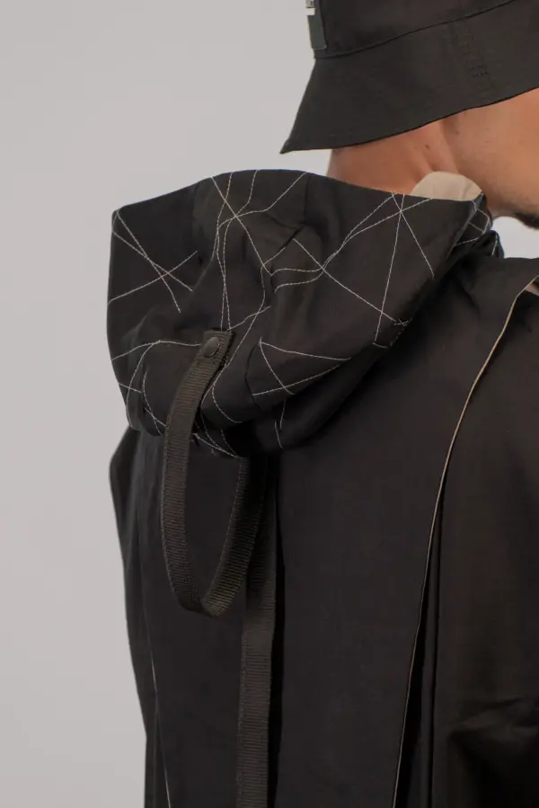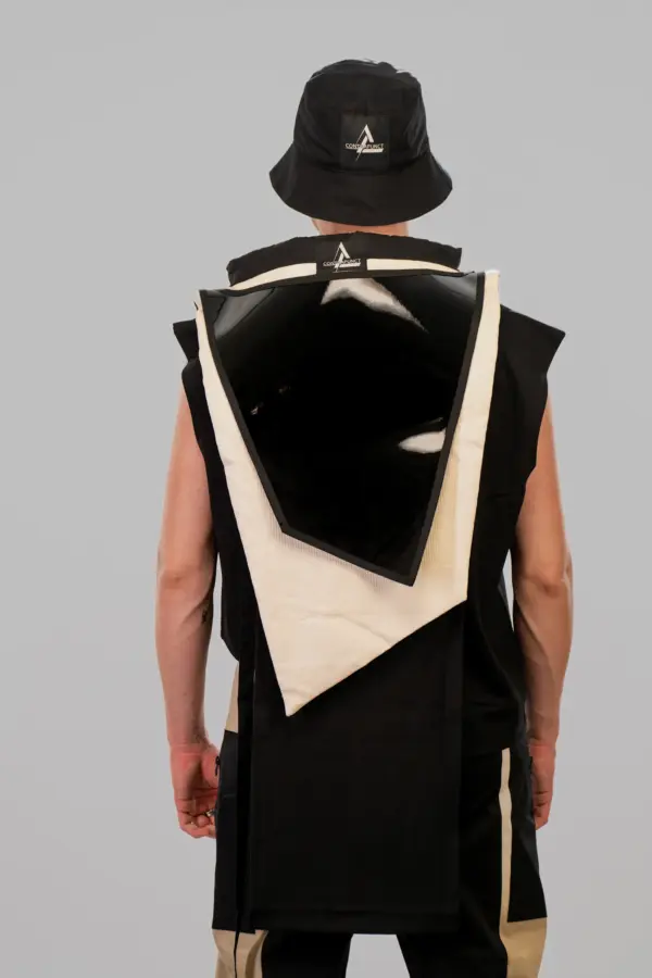 189,00 €A CONTRAPUNCT black hood featuring white topstitches as distinctive details and a grey inner lining, exemplifies futuristic design principles. This unisex hood is designed for versatility, allowing it to be worn over or under outerwear. A distinctive rib tape starts from the front, secured by a snap button, and ends […]