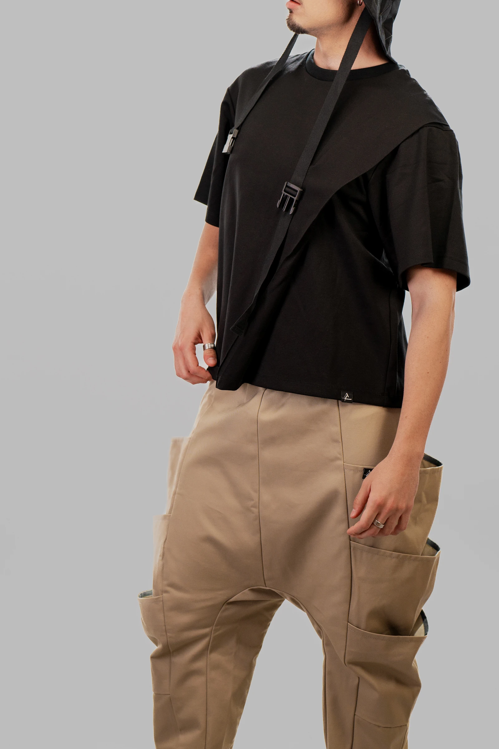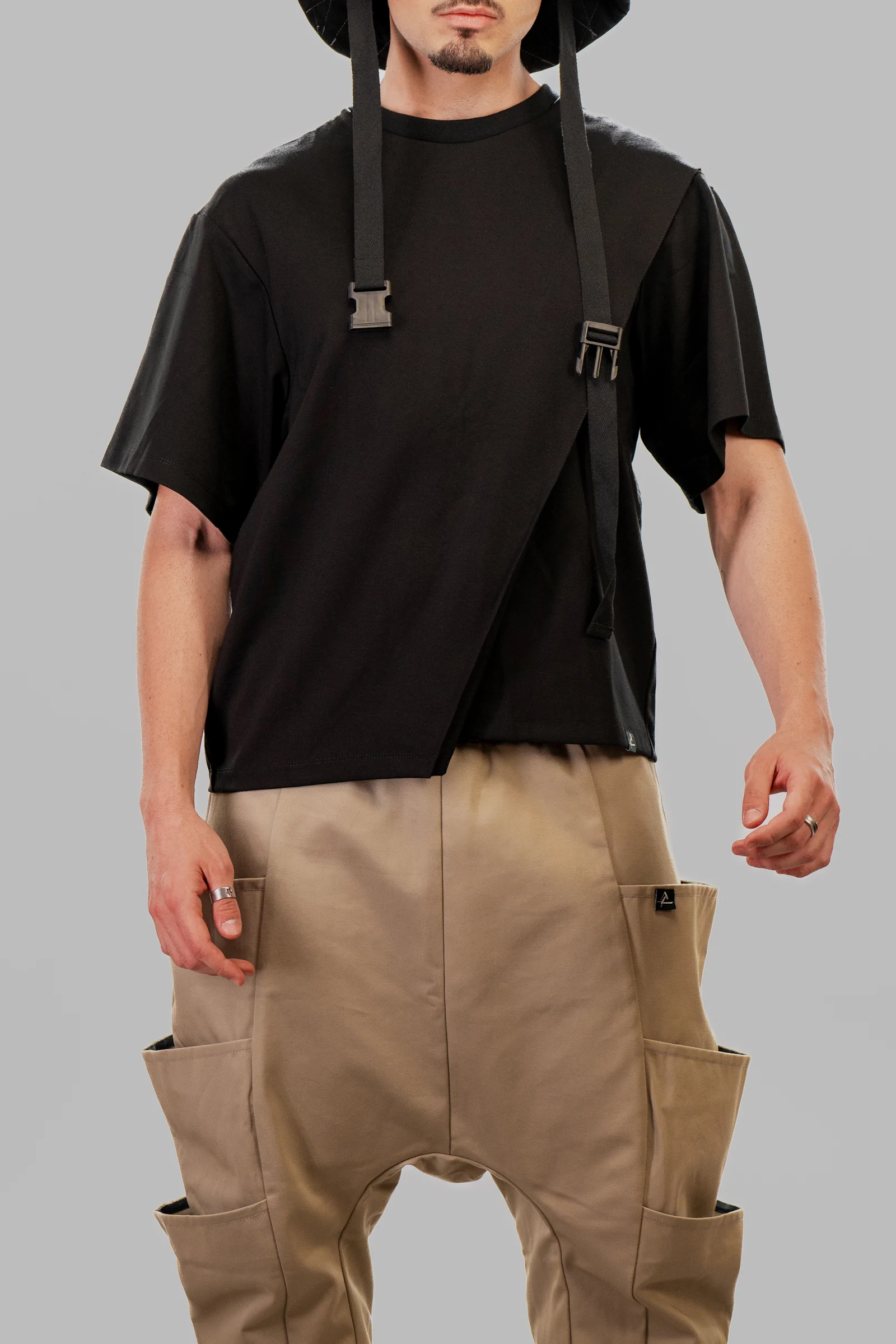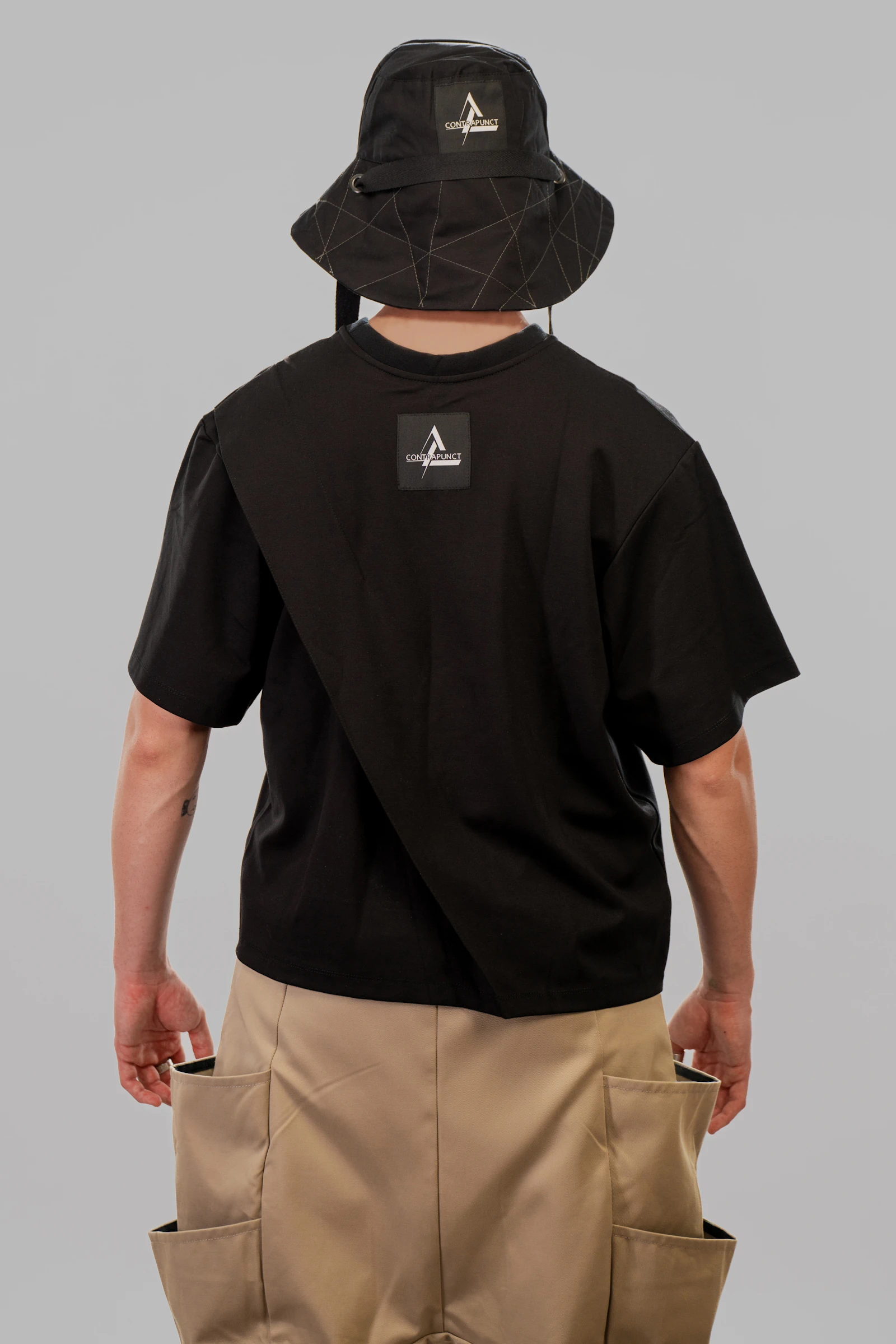 The CONTRAPUNCT asymmetric black t-shirt explores minimalist distortion through its unconventional silhouette. The design features an asymmetrical cut, enhanced by wide pleats placed on both the front and the back. Each pleat extends from the neckline to the hem and opens freely toward the bottom, adding volume, depth, and dynamic movement to the garment. Consistent with the brand’s design philosophy, the CONTRAPUNCT branding label is prominently placed on the exterior of the garment, ensuring visibility and reinforcing the brand’s signature style.