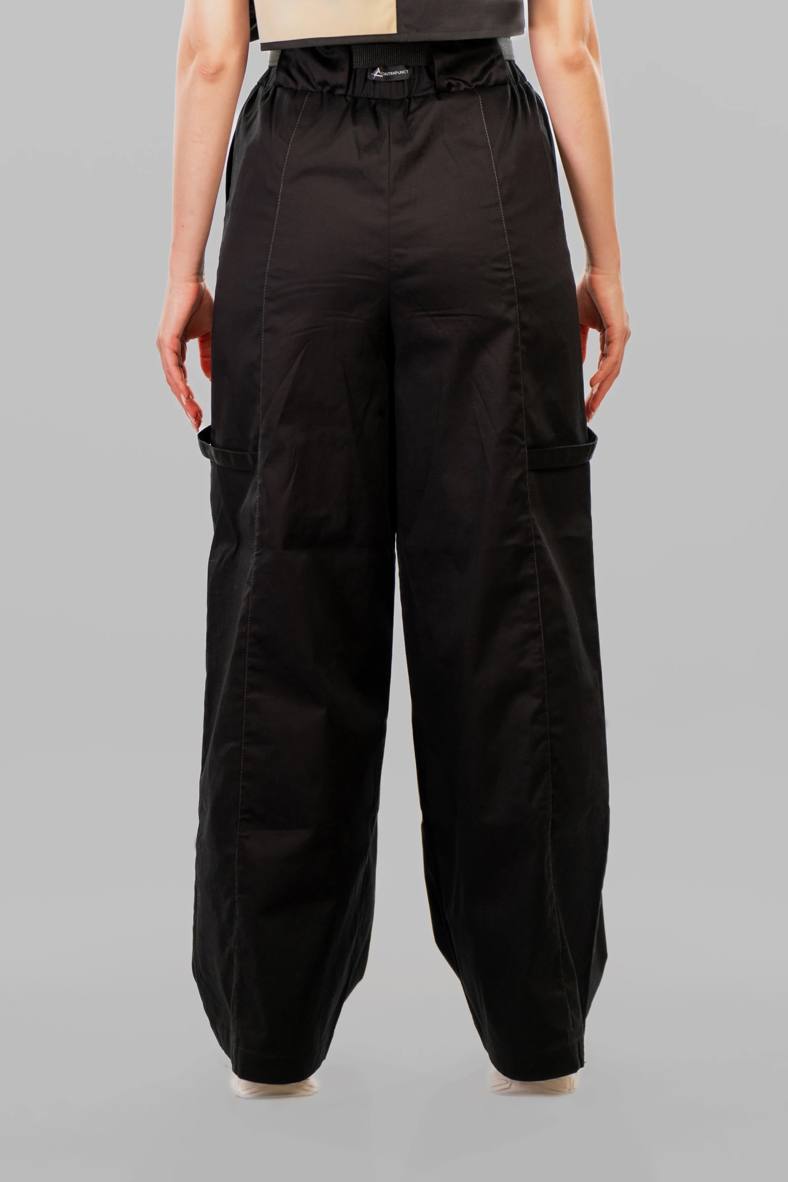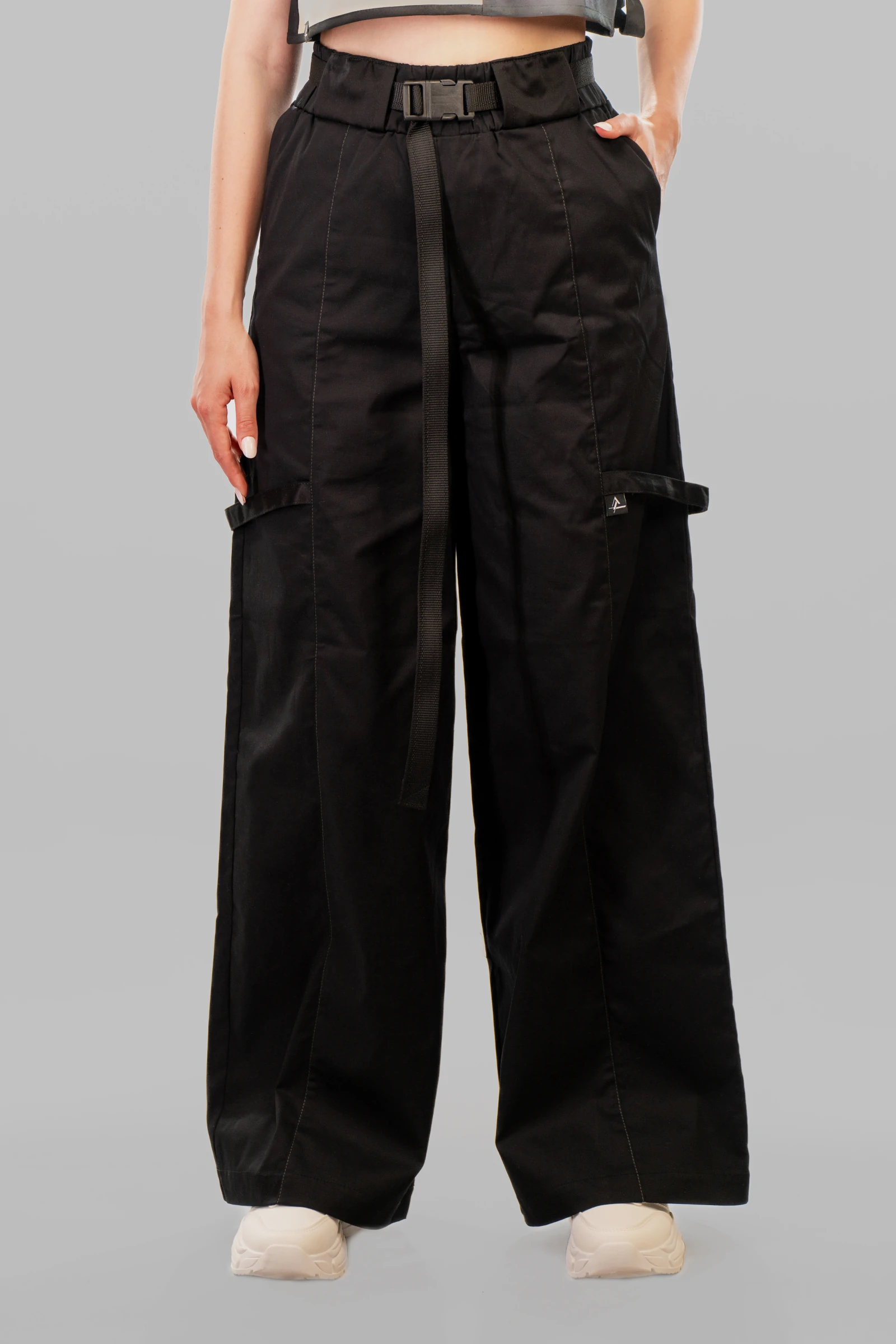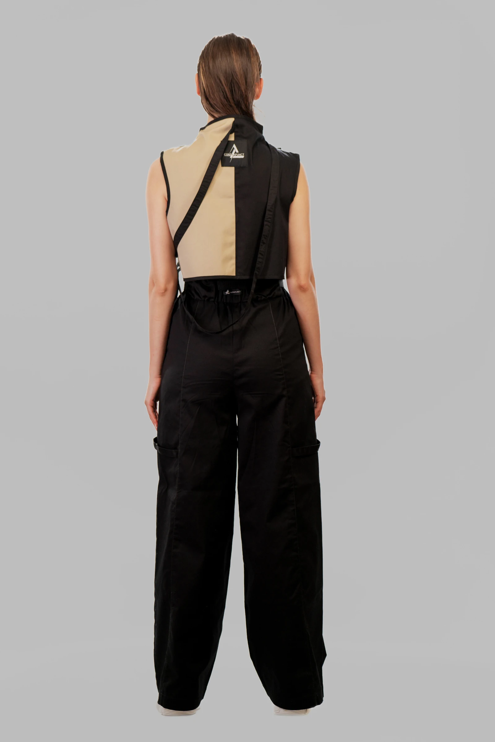 The CONTRAPUNCT black multiple piece pants embrace structural minimalism through a combination of clean construction and bold detailing. Crafted from black cotton, the design features an elastic waistband for added comfort, paired with a plastic buckle belt threaded through four wide loops to enhance visibility and structure. White decorative topstitching runs centrally down the front and back of each leg, creating a sharp visual line and emphasizing the garment’s architectural form. Two hidden side pockets maintain a clean silhouette, while two decorative straps on each side of the leg add dimensionality and a utilitarian edge. Consistent with the brand’s design philosophy, the CONTRAPUNCT branding label is prominently placed on the exterior of the garment, ensuring visibility and reinforcing the brand’s signature style.