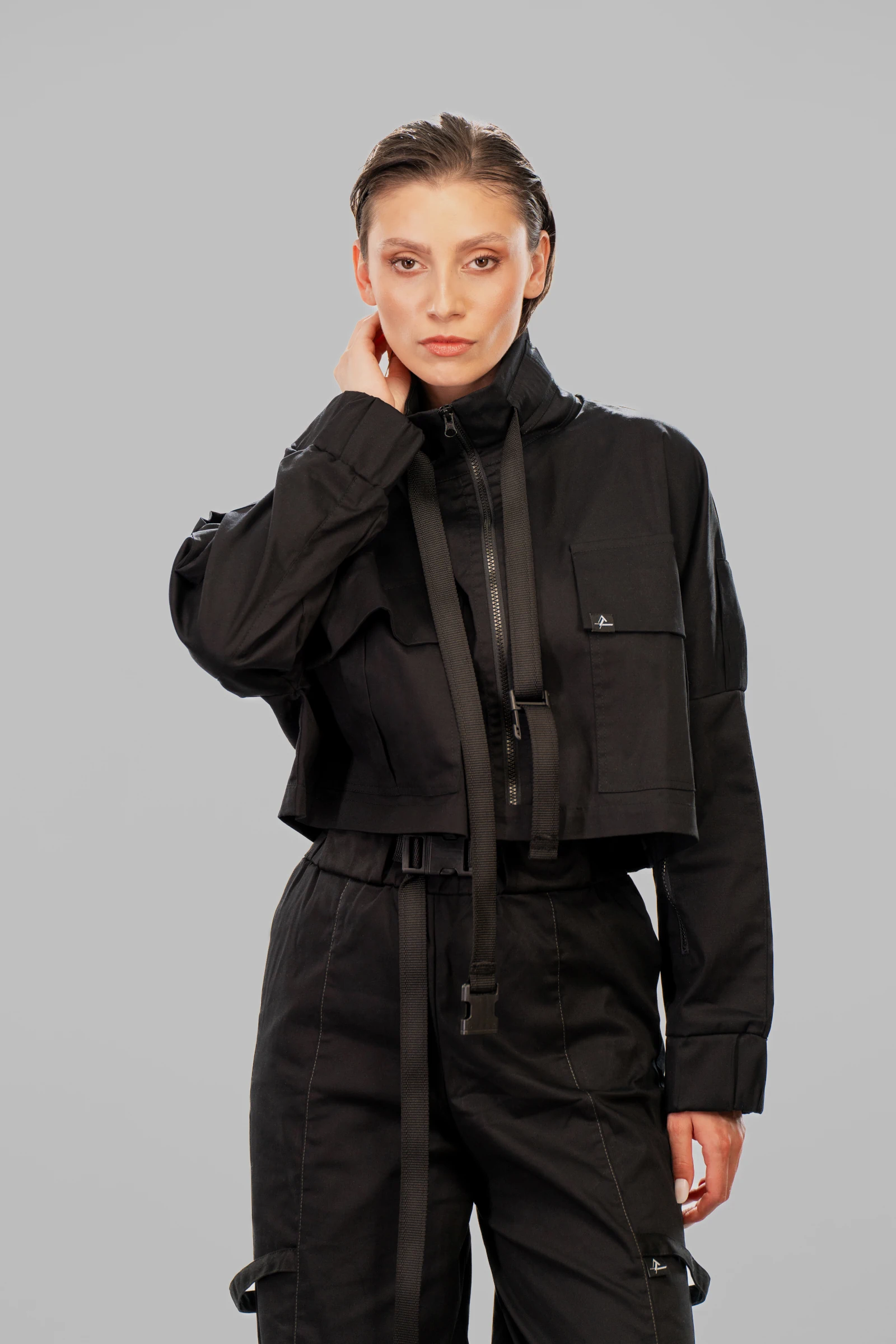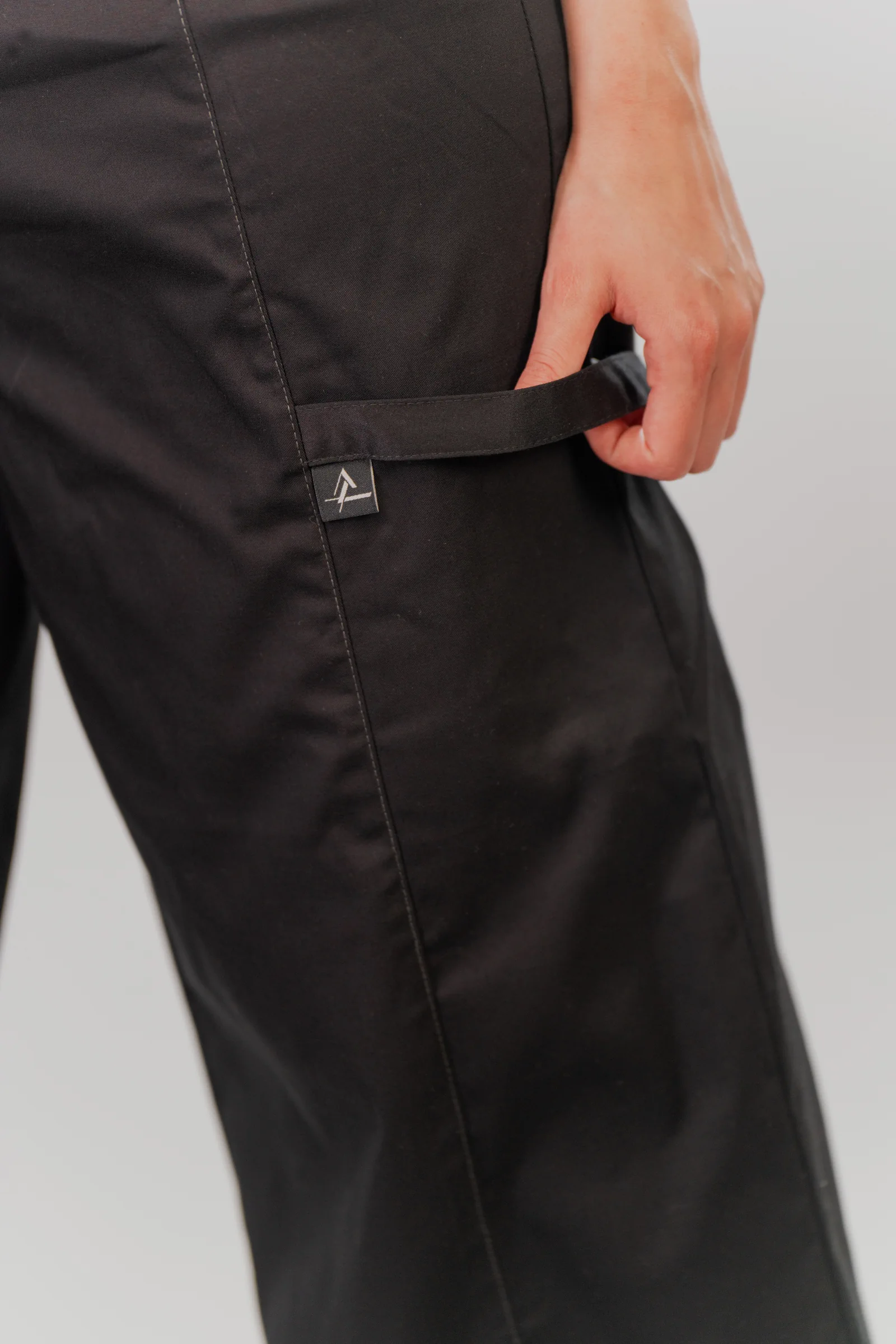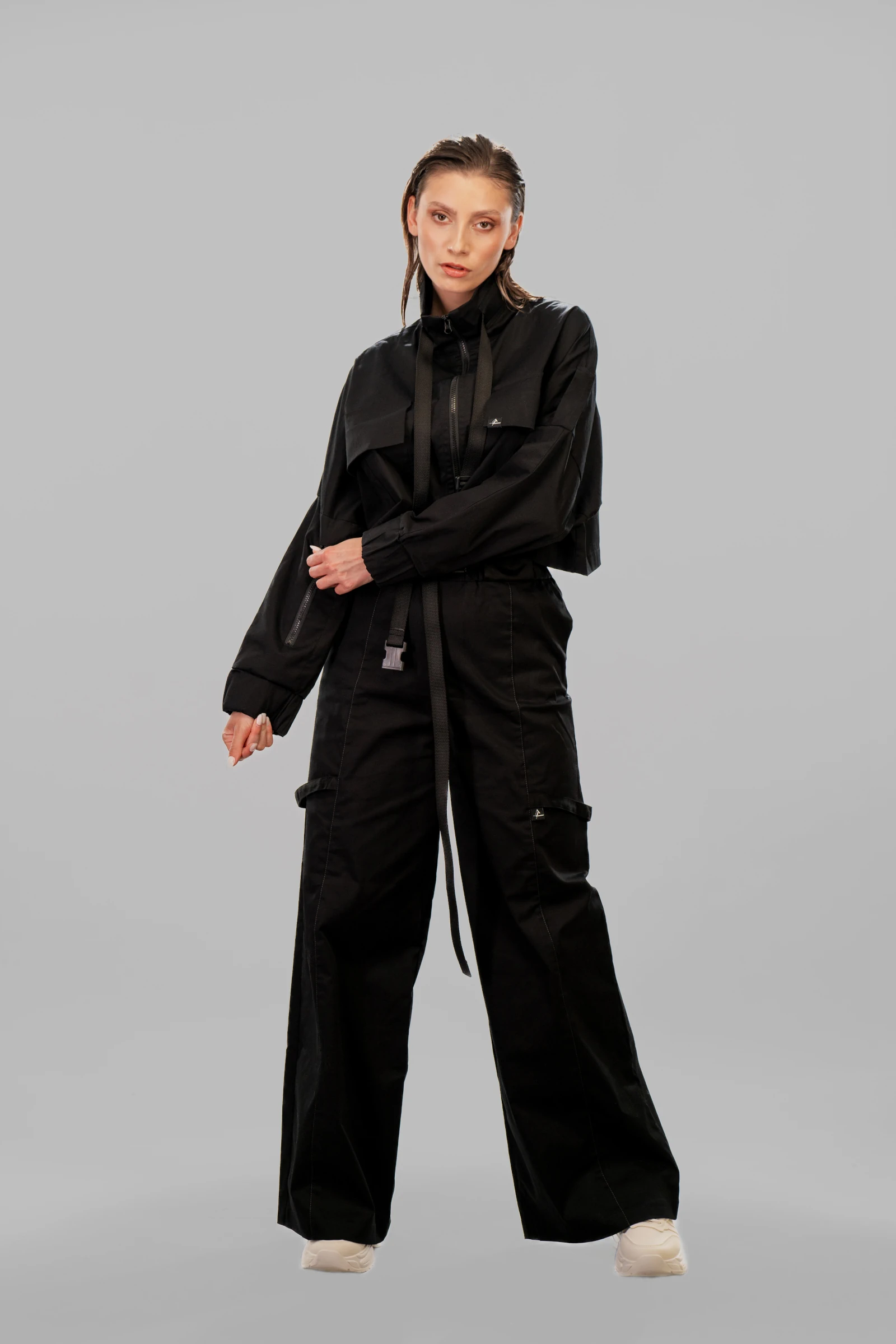 The CONTRAPUNCT black multiple piece pants embrace structural minimalism through a combination of clean construction and bold detailing. Crafted from black cotton, the design features an elastic waistband for added comfort, paired with a plastic buckle belt threaded through four wide loops to enhance visibility and structure. White decorative topstitching runs centrally down the front and back of each leg, creating a sharp visual line and emphasizing the garment’s architectural form. Two hidden side pockets maintain a clean silhouette, while two decorative straps on each side of the leg add dimensionality and a utilitarian edge. Consistent with the brand’s design philosophy, the CONTRAPUNCT branding label is prominently placed on the exterior of the garment, ensuring visibility and reinforcing the brand’s signature style.