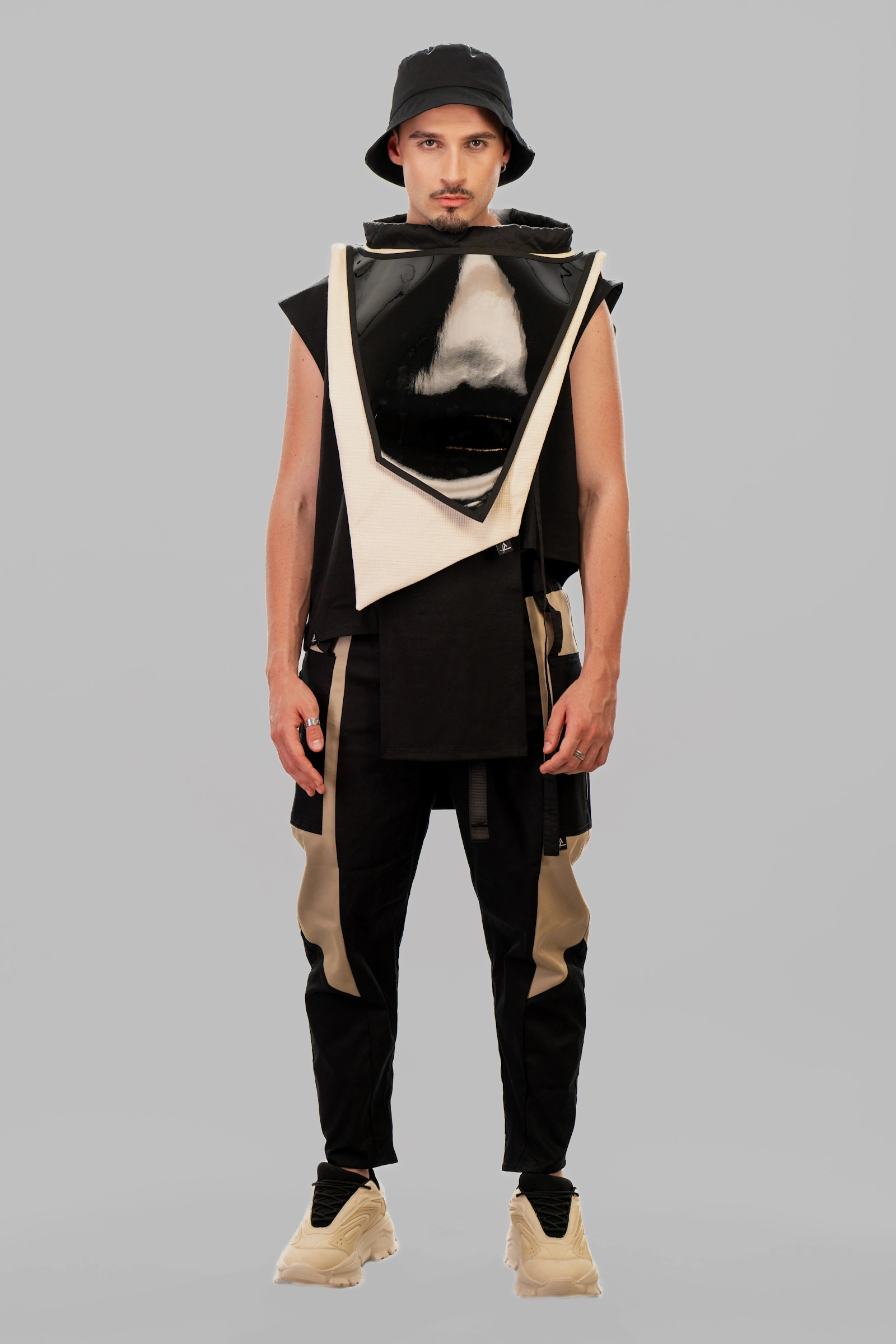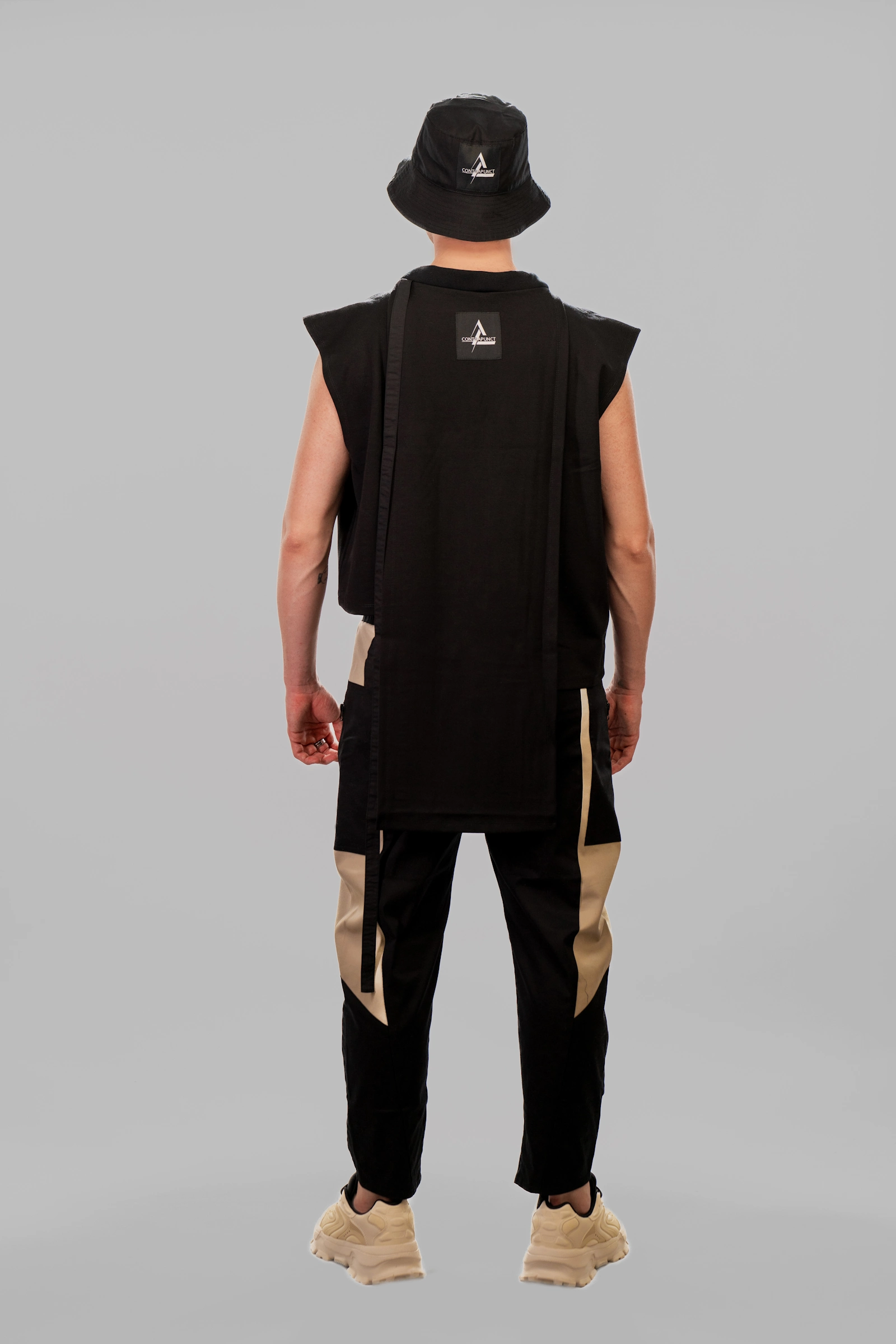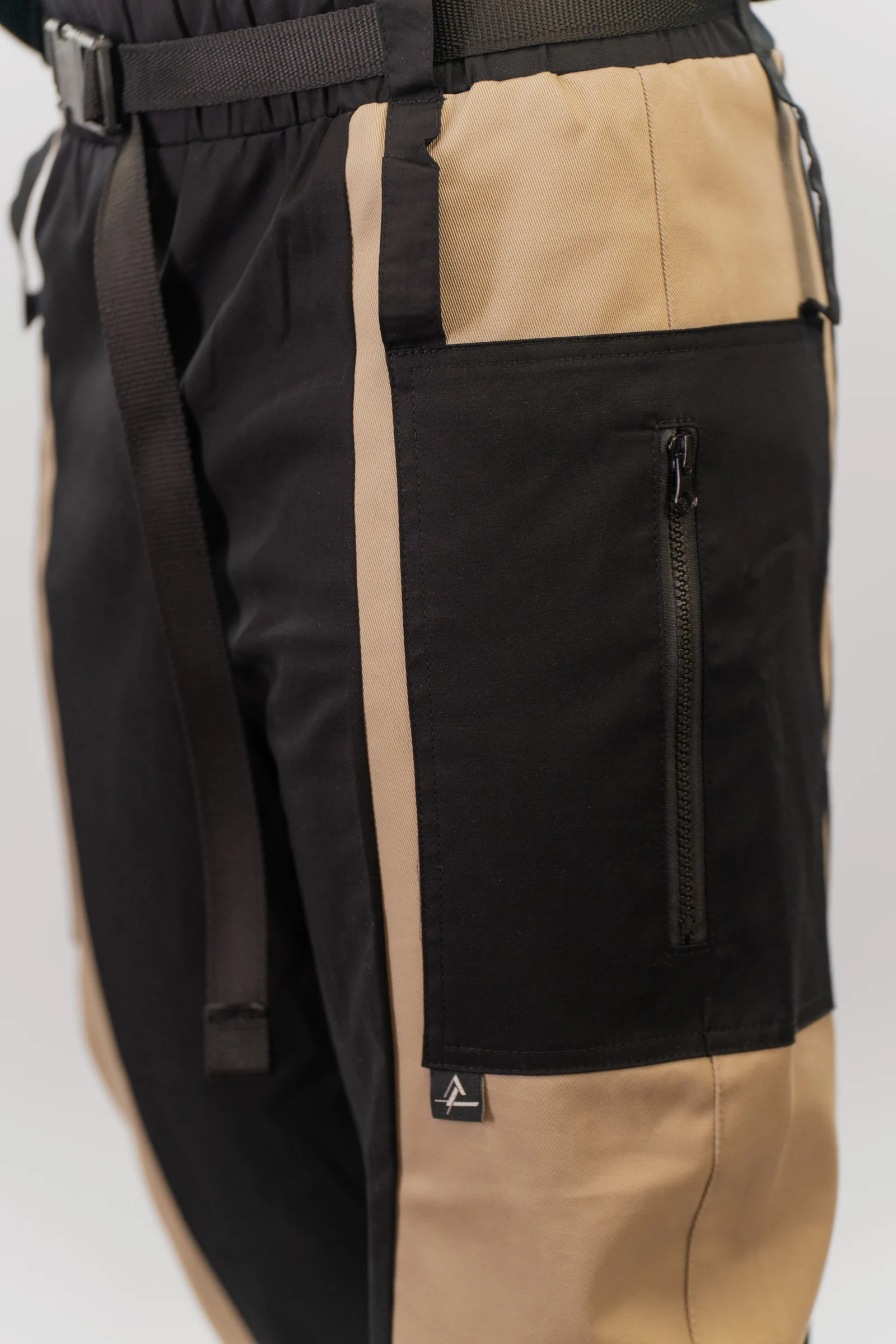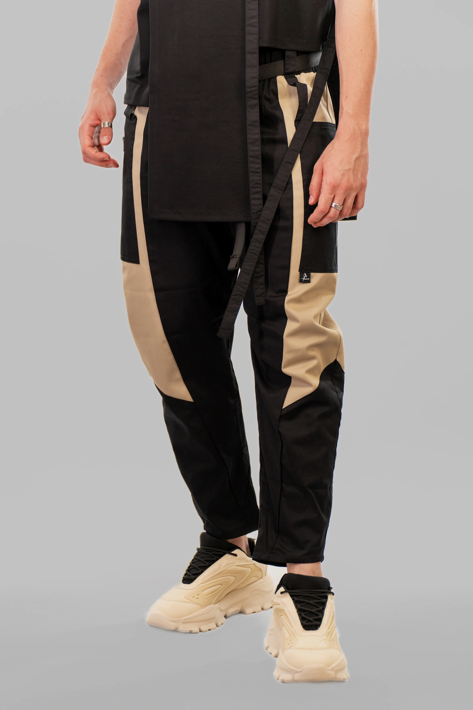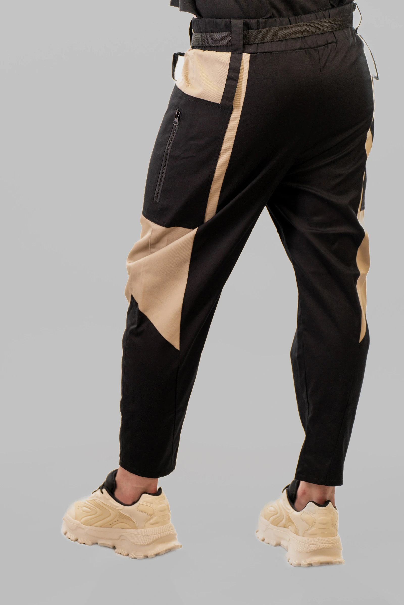 The CONTRAPUNCT black multiple-piece pants showcase a dynamic fusion of form and function, crafted from a combination of black and beige cotton fabric panels. The diagonal cuts create a bold geometric aesthetic, mirrored symmetrically on both sides. Functional elements include two zippered side pockets and integrated design straps that extend from the waistband to the pockets, enhancing both structure and utility. The trousers come with a black belt featuring a plastic trim for an adjustable fit. For added comfort, the composition and size labels are placed inside the pocket. Consistent with the brand’s design philosophy, the CONTRAPUNCT branding label is prominently placed on the exterior of the garment, ensuring visibility and reinforcing the brand’s signature style.