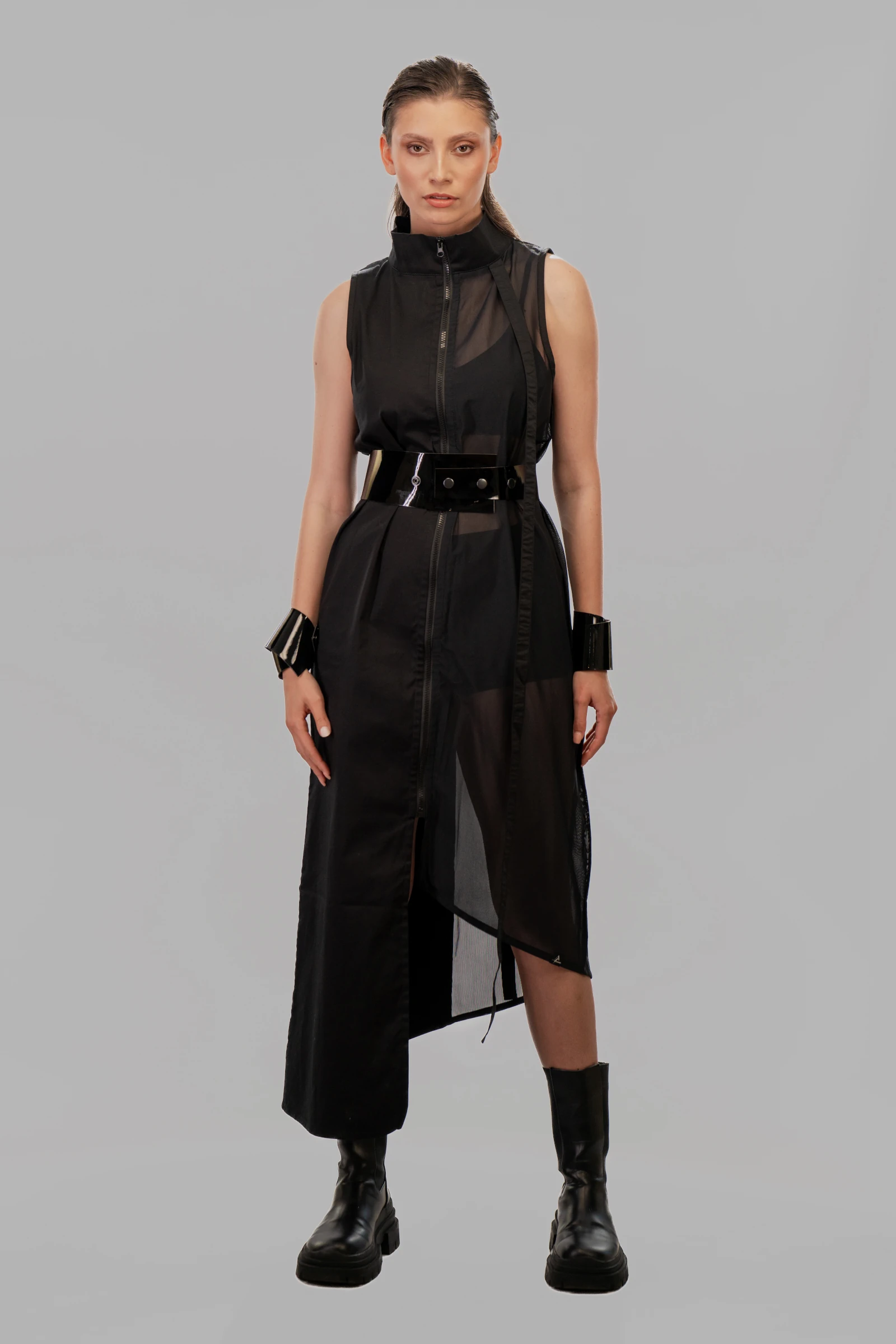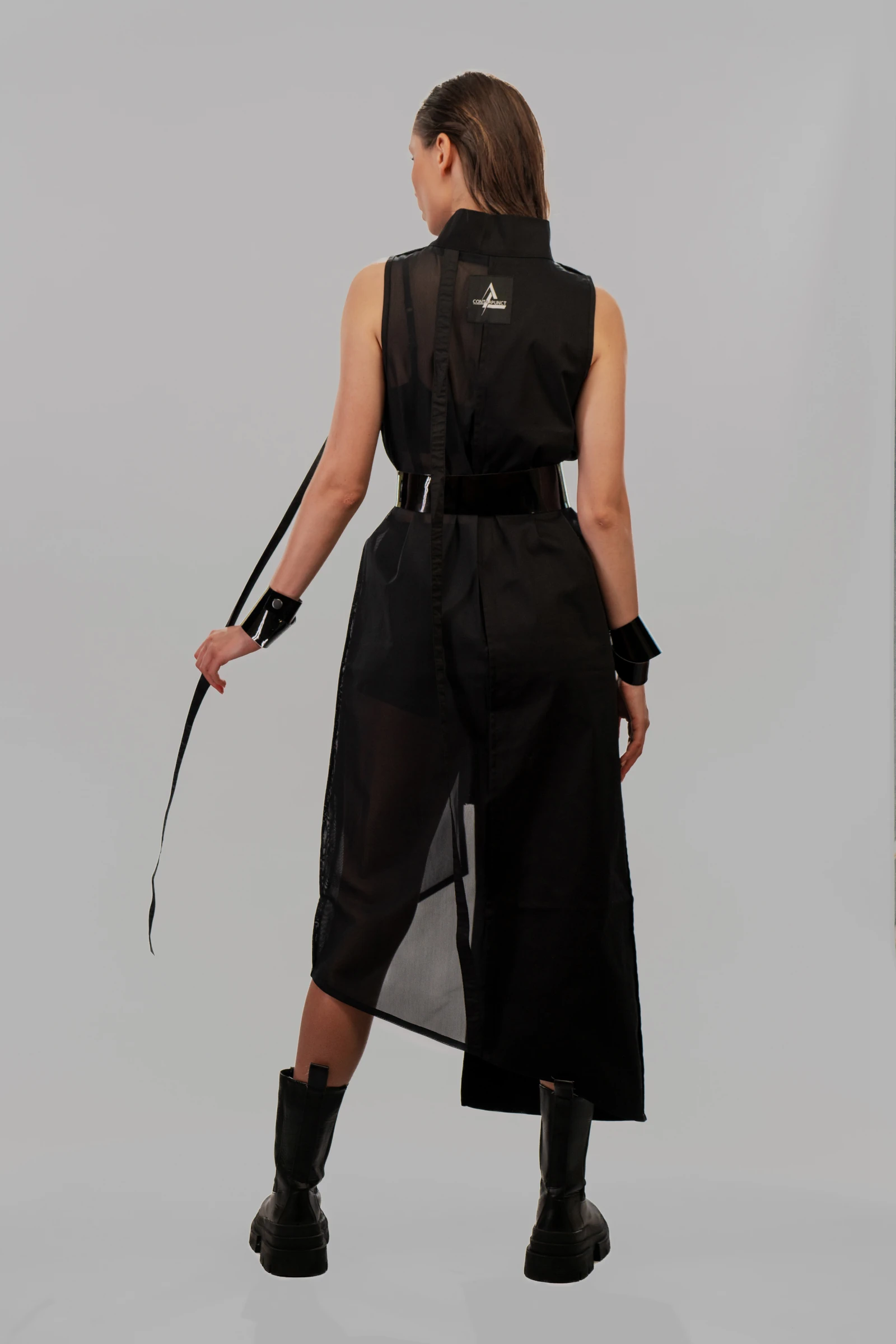 The CONTRAPUNCT semi transparent black dress explores contrast and asymmetry through bold material pairing and structural nuance. One half of the dress – both front and back – is constructed from solid black cotton, while the other half is made from semi-transparent black mesh, creating a play between opacity and lightness. The silhouette is asymmetrical, with one side cut longer than the other, forming a fluid A-line shape. A front zipper allows for ease of wear, while the garment is framed with black binding that defines the form. A standing collar adds definition, from which long black cotton tapes extend both at the front and back, contributing to movement and layering. The design also allows the piece to be worn open as a statement vest, enhancing its styling versatility.