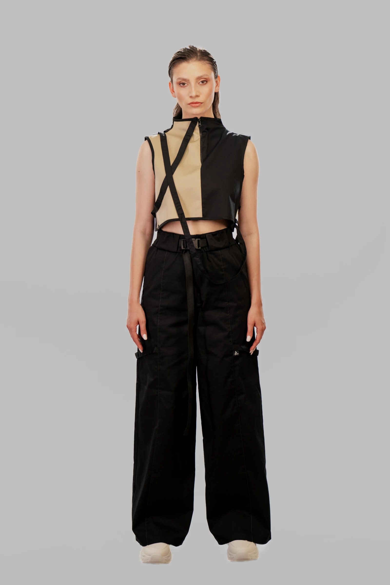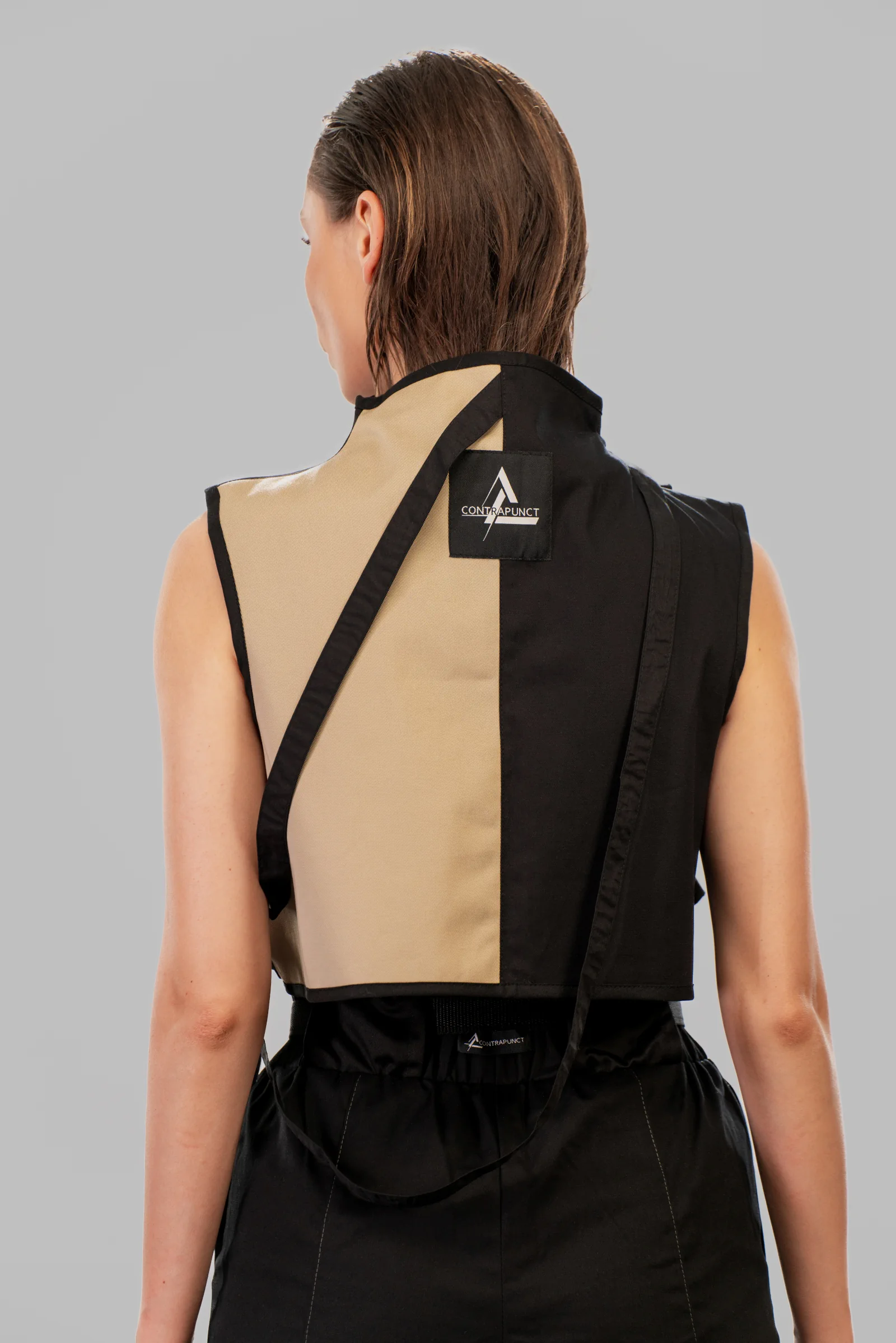 The CONTRAPUNCT taped crop top showcases a dynamic interplay of color and form, blending beige and black cotton panels for a striking, high-contrast look. The silhouette is framed with black fabric along the edges, reinforcing its sculptural shape. A front zipper at the turtleneck ensures ease of wear and adds a utilitarian accent. Black cotton tape elements cross both the front and back of the body, attached at the shoulders while falling freely for a layered and dimensional appearance. Consistent with the brand’s design philosophy, the CONTRAPUNCT branding label is prominently placed on the exterior of the garment, ensuring visibility and reinforcing the brand’s signature style.