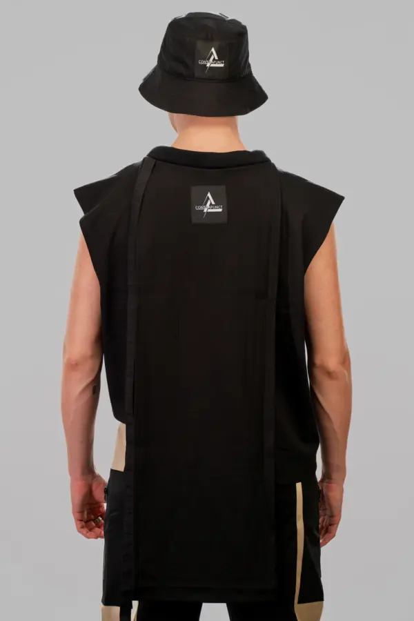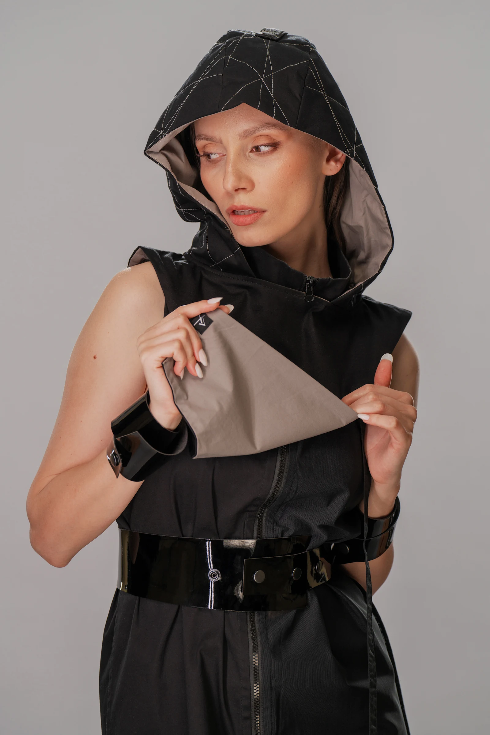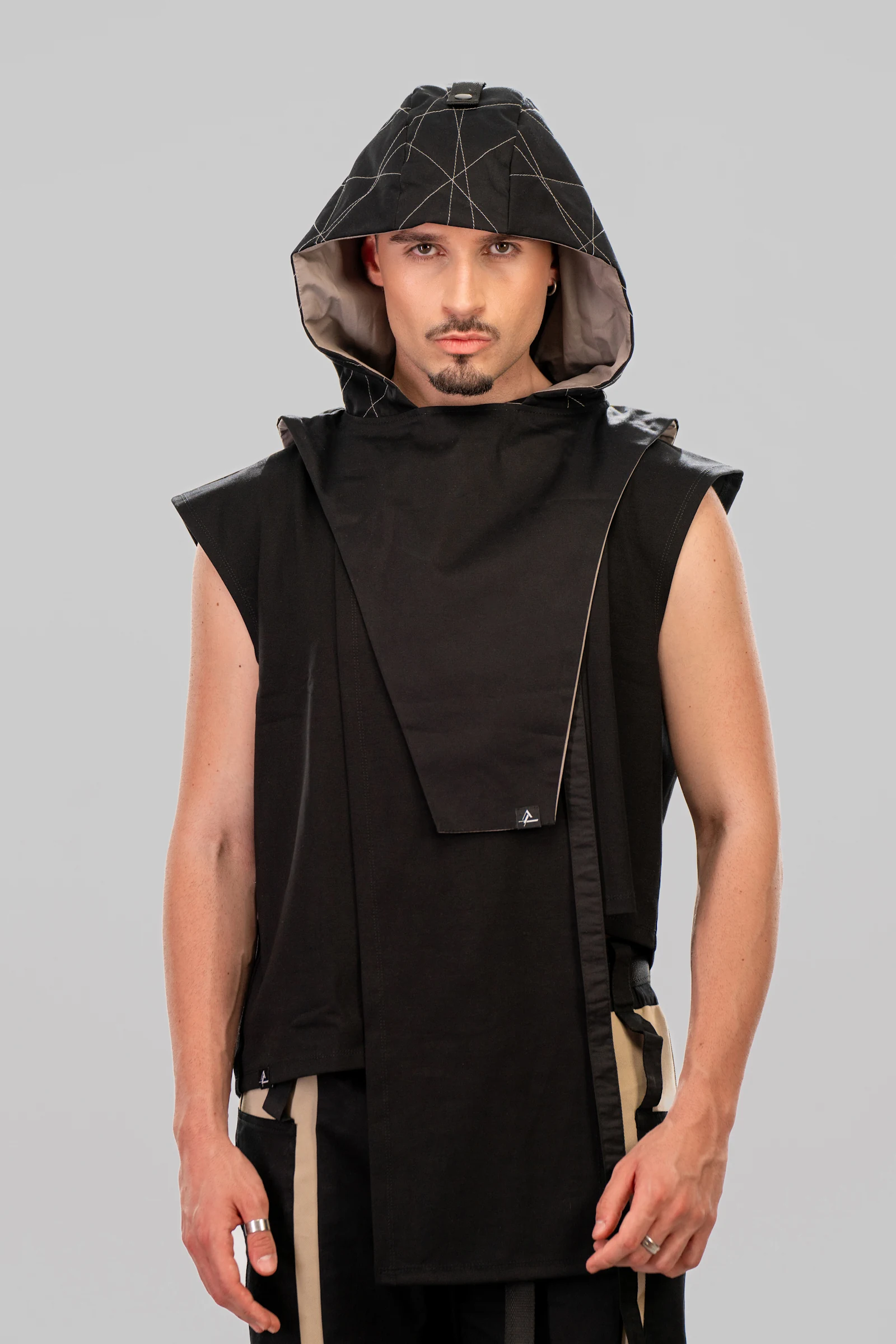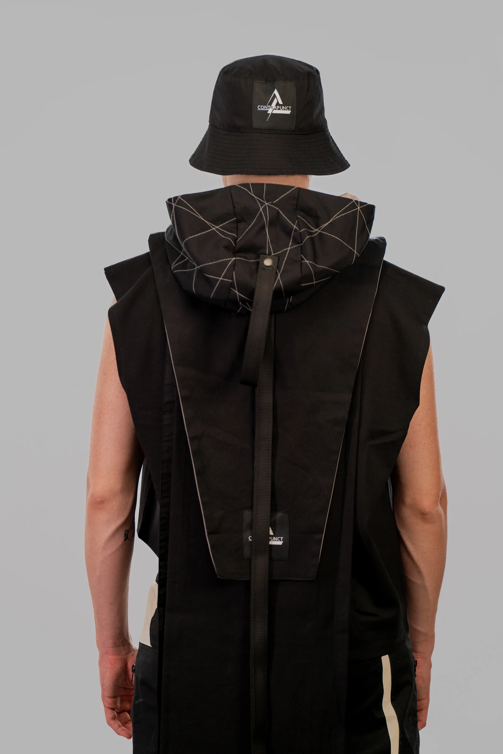 A CONTRAPUNCT black hood featuring white topstitches as distinctive details and a grey inner lining, exemplifies futuristic design principles. This unisex hood is designed for versatility, allowing it to be worn over or under outerwear. A distinctive rib tape starts from the front, secured by a snap button, and ends freely at the back. Consistent with the brand’s design philosophy, the CONTRAPUNCT label is prominently placed on the exterior of the garment, ensuring visibility and reinforcing the brand’s signature style.