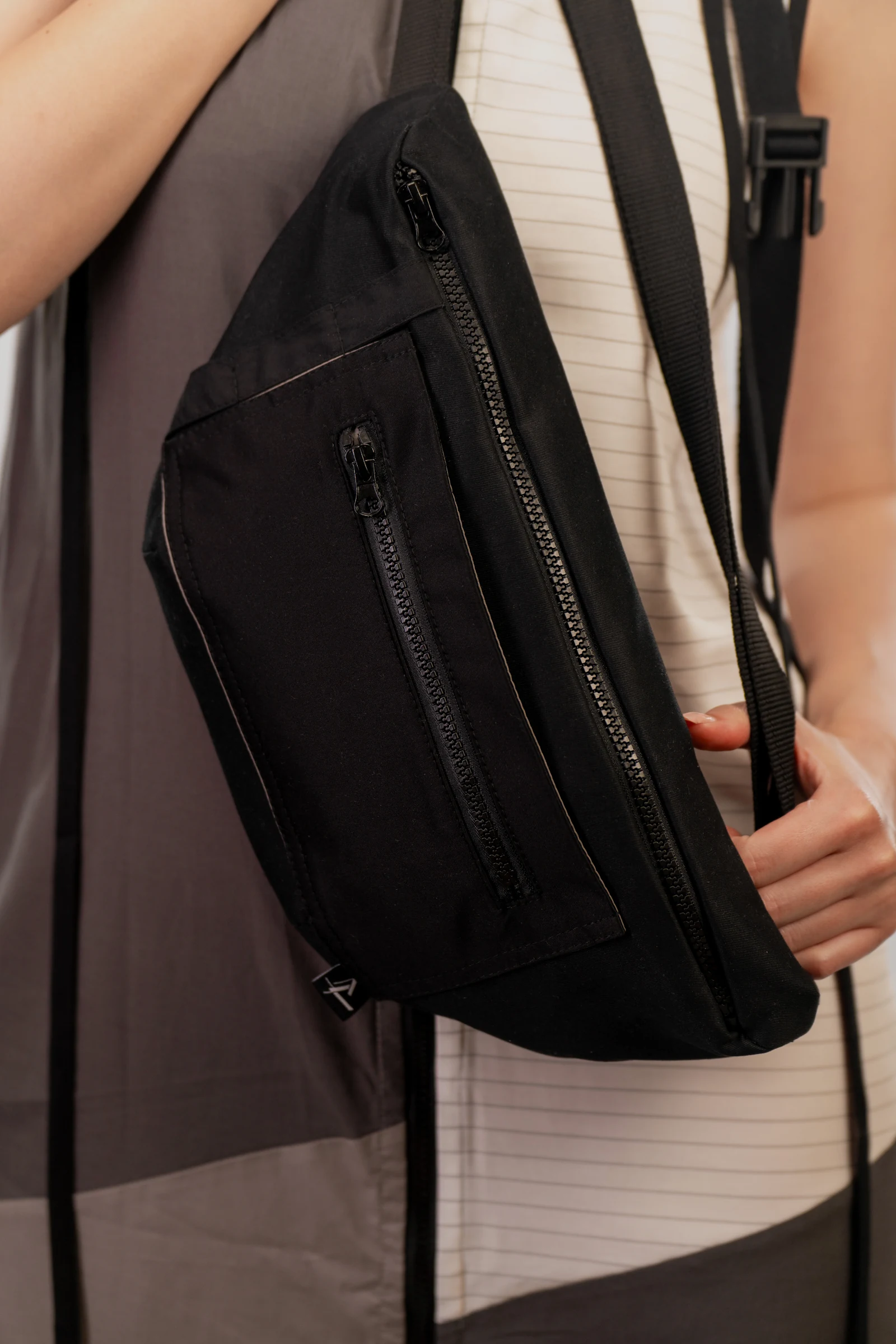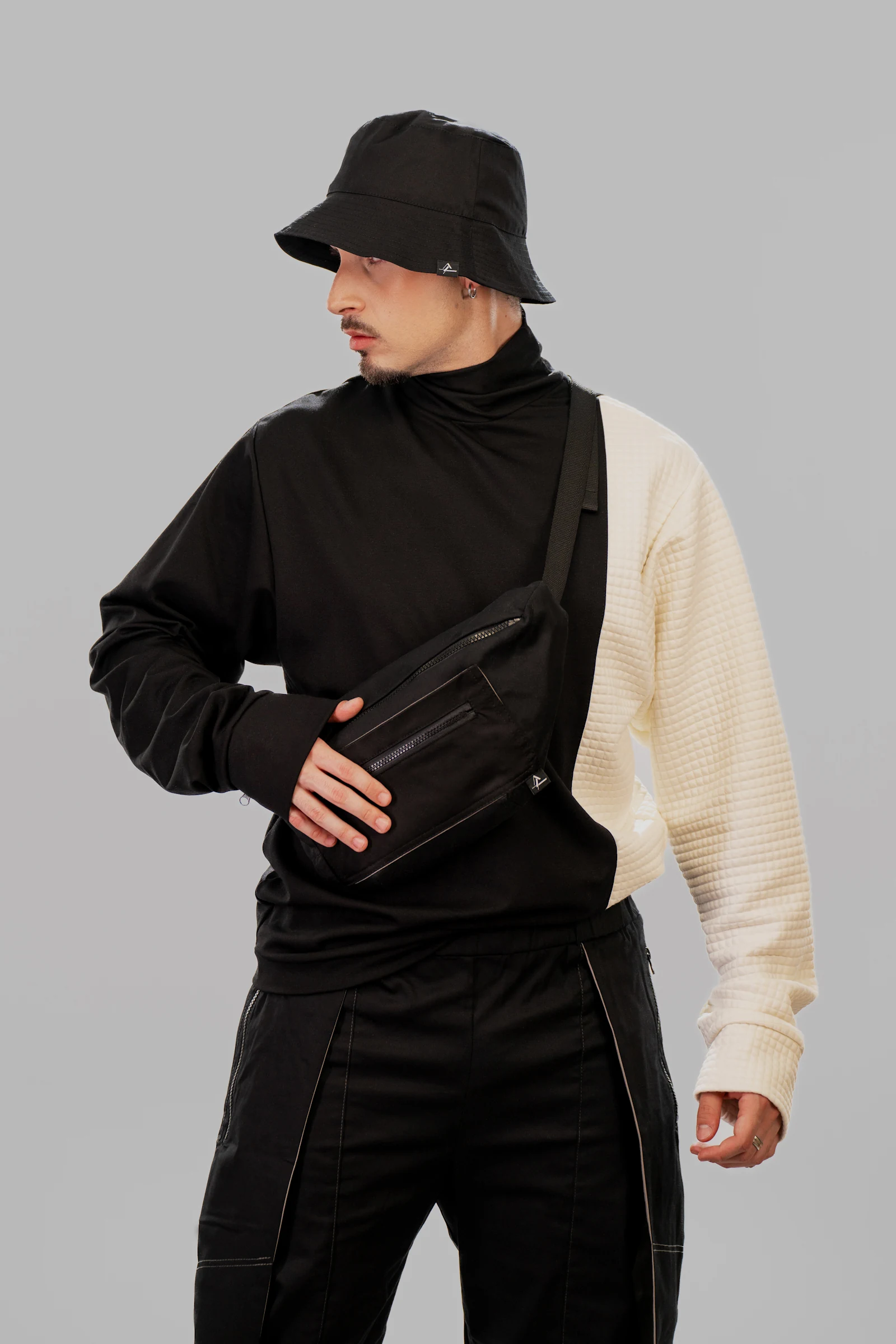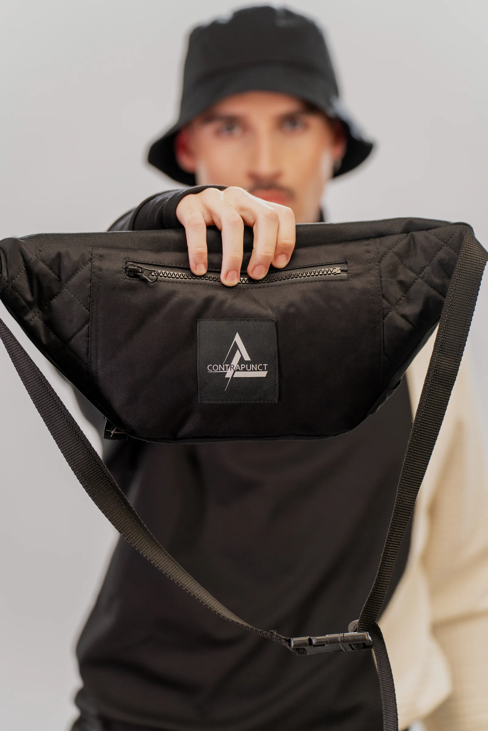 The CONTRAPUNCT unisex matte-shiny fanny pack blends functionality with a futuristic aesthetic, featuring a contrast of matte and shiny textures. The design includes a main compartment secured with a zipper, providing essential storage. Attached to the body is an open pocket, layered with a second zippered pocket for additional organization. The back panel is crafted from black quilted cotton, offering both comfort and structure, and includes an additional zippered pocket for secure storage. Consistent with the brand’s design philosophy, the CONTRAPUNCT branding label is prominently placed on the exterior of the fanny pack, ensuring visibility and reinforcing the brand’s signature style.