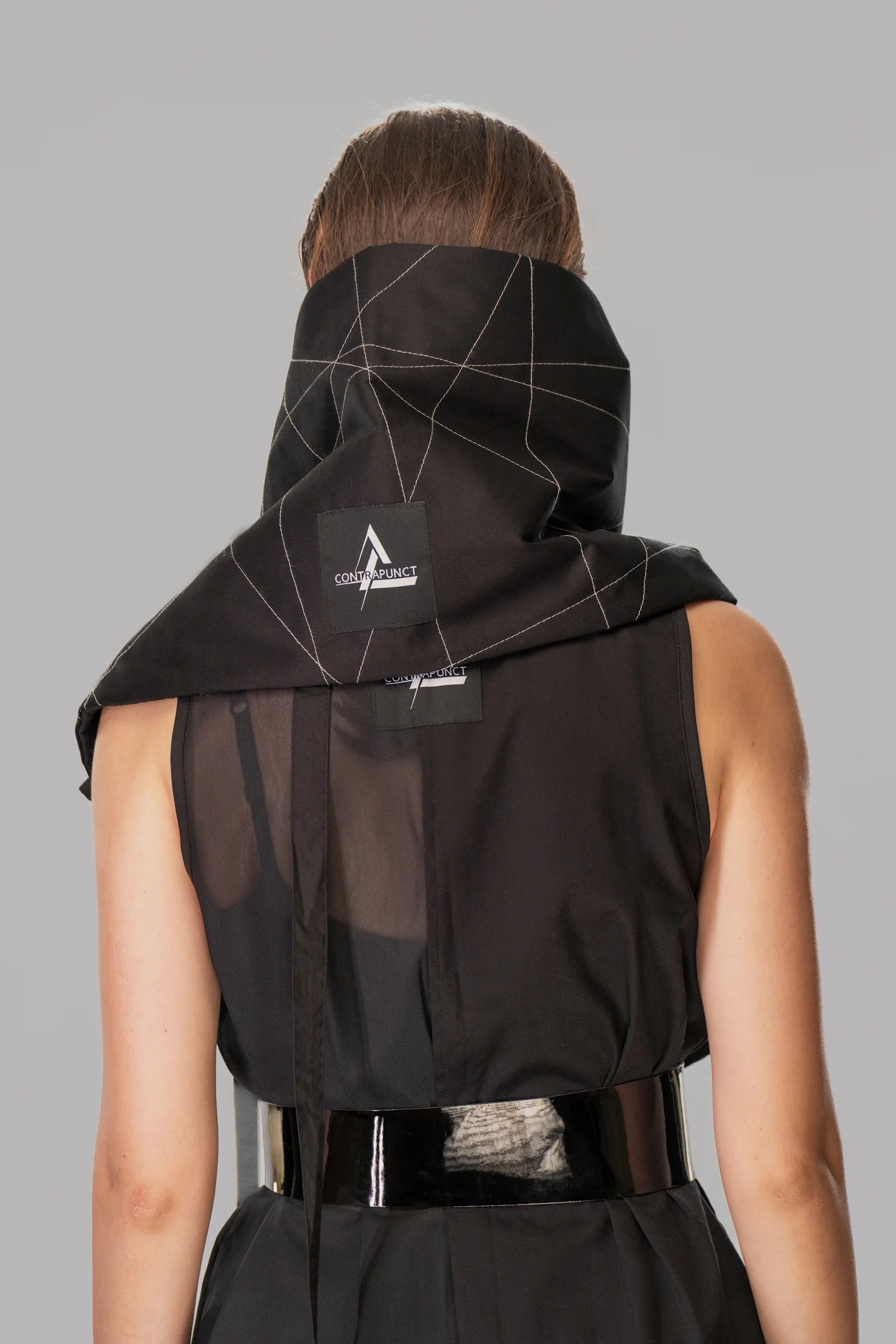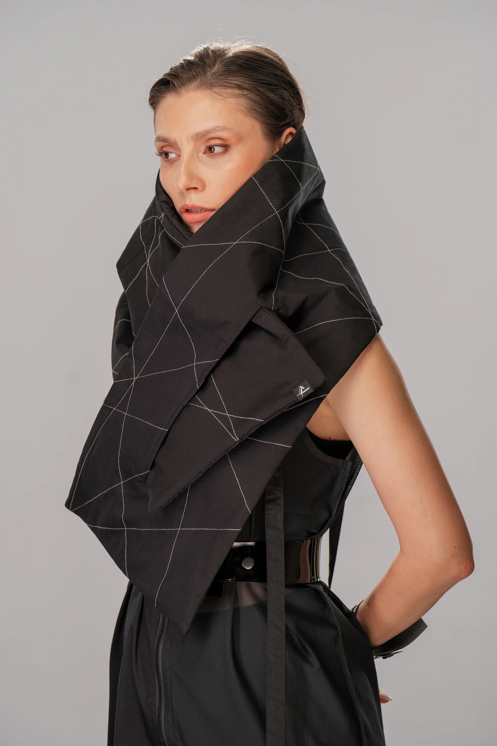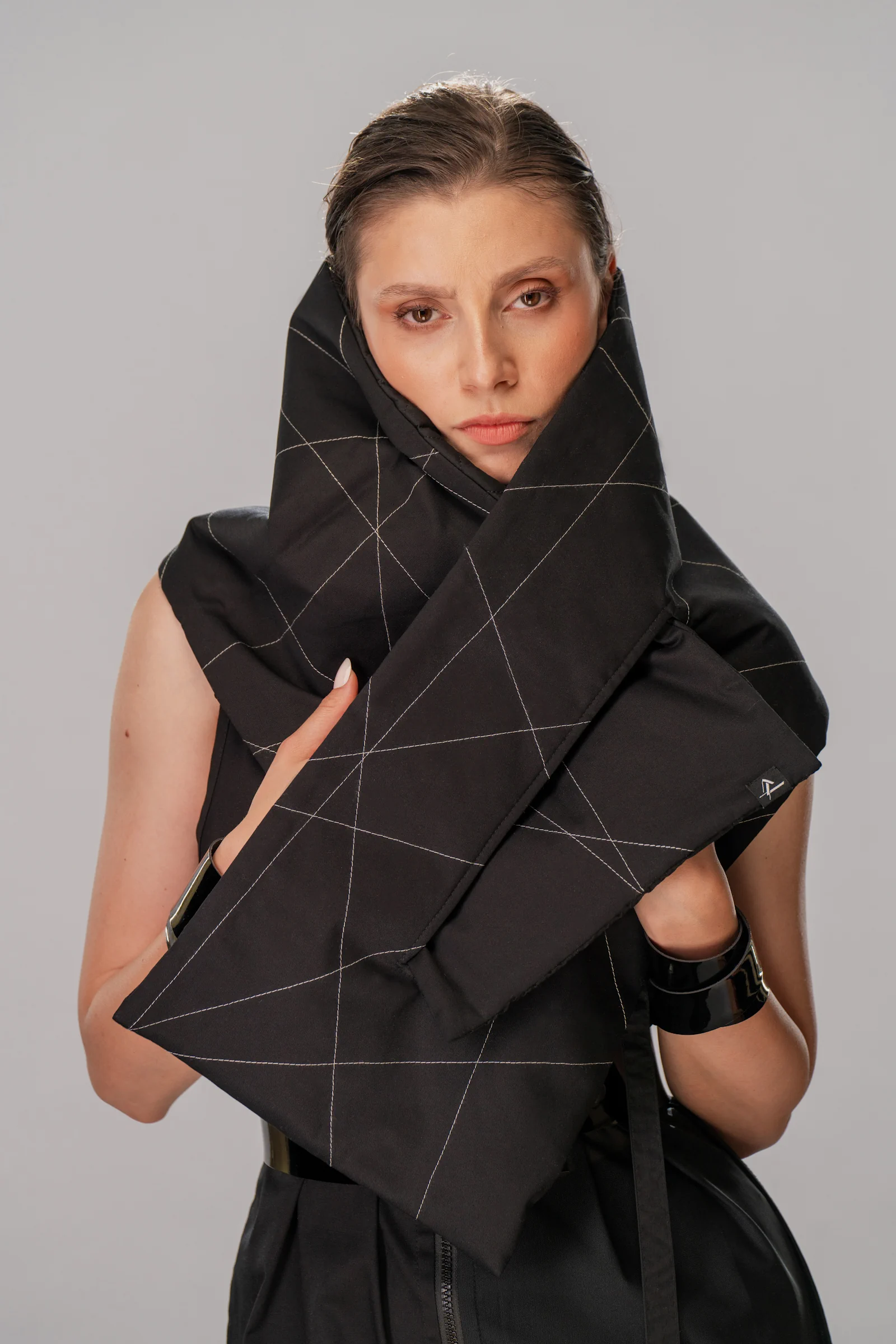 The CONTRAPUNCT quilted topstitched scarf exemplifies futuristic design principles, featuring a black cotton exterior with white topstitches and a quilted black interior for added warmth and texture. The design includes a functional opening that allows the scarf to be crossed through, ensuring both a secure fit and a distinctive aesthetic. Consistent with the brand’s design philosophy, the CONTRAPUNCT branding label is prominently placed on the exterior of the garment, ensuring visibility and reinforcing the brand’s signature style.