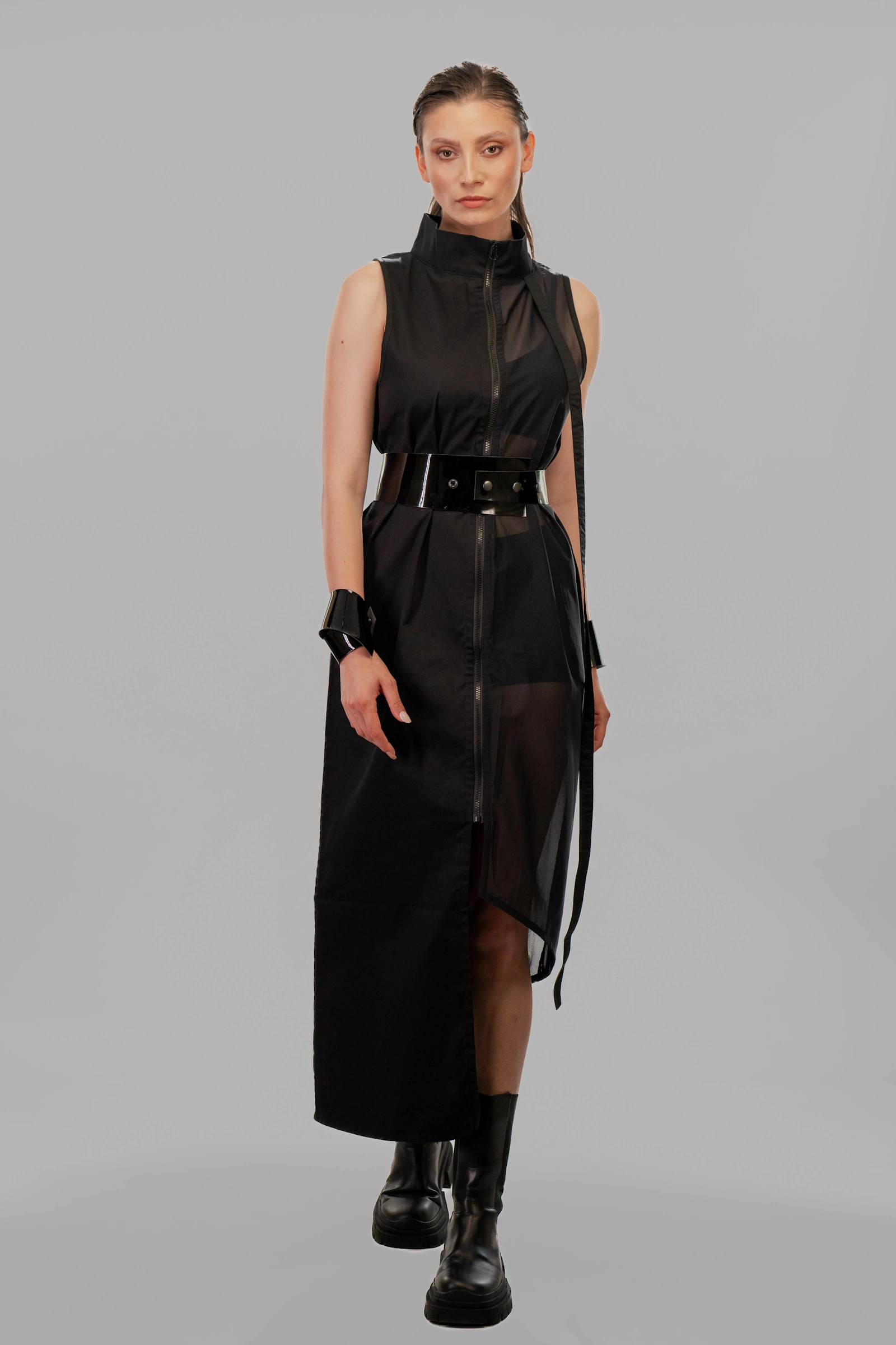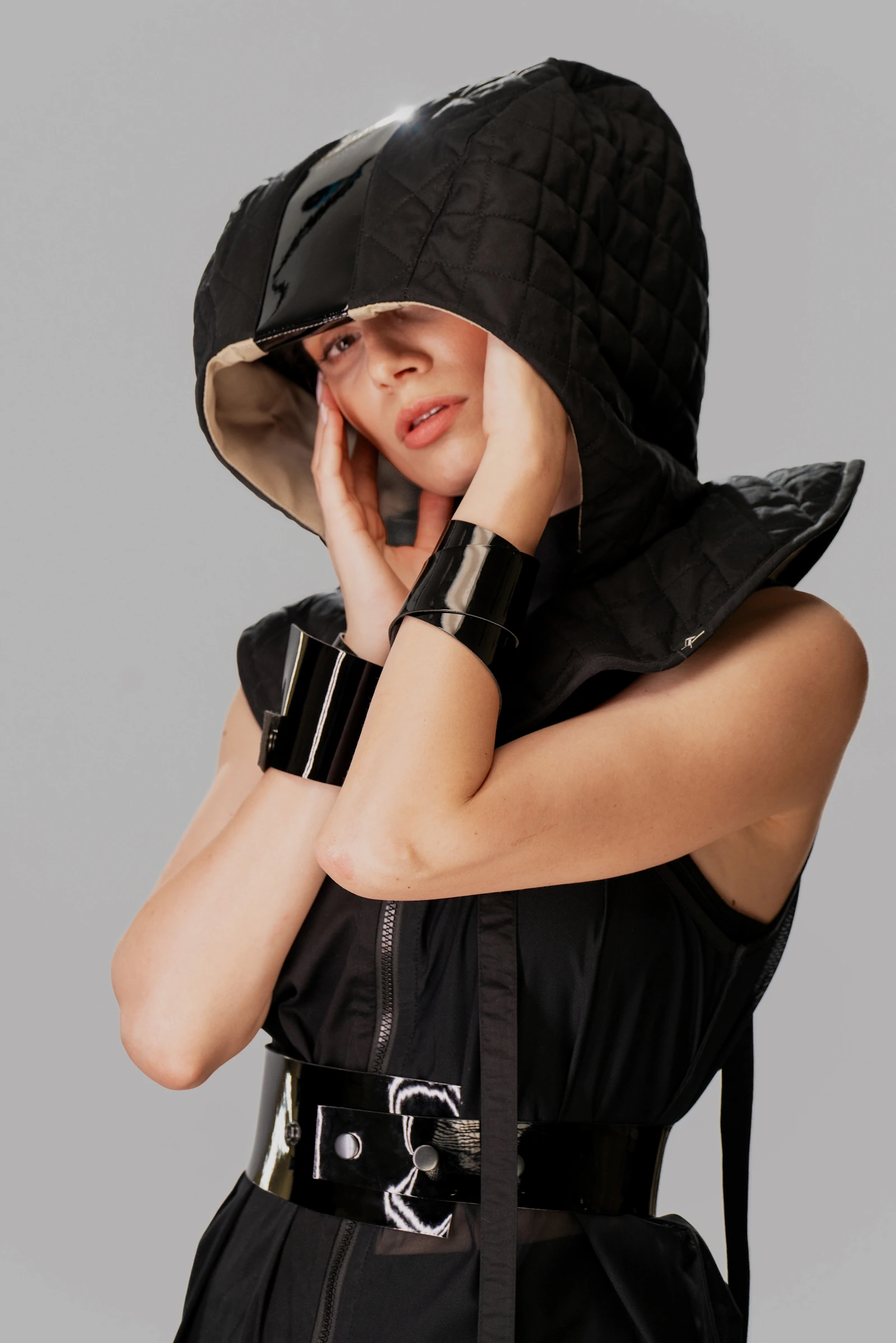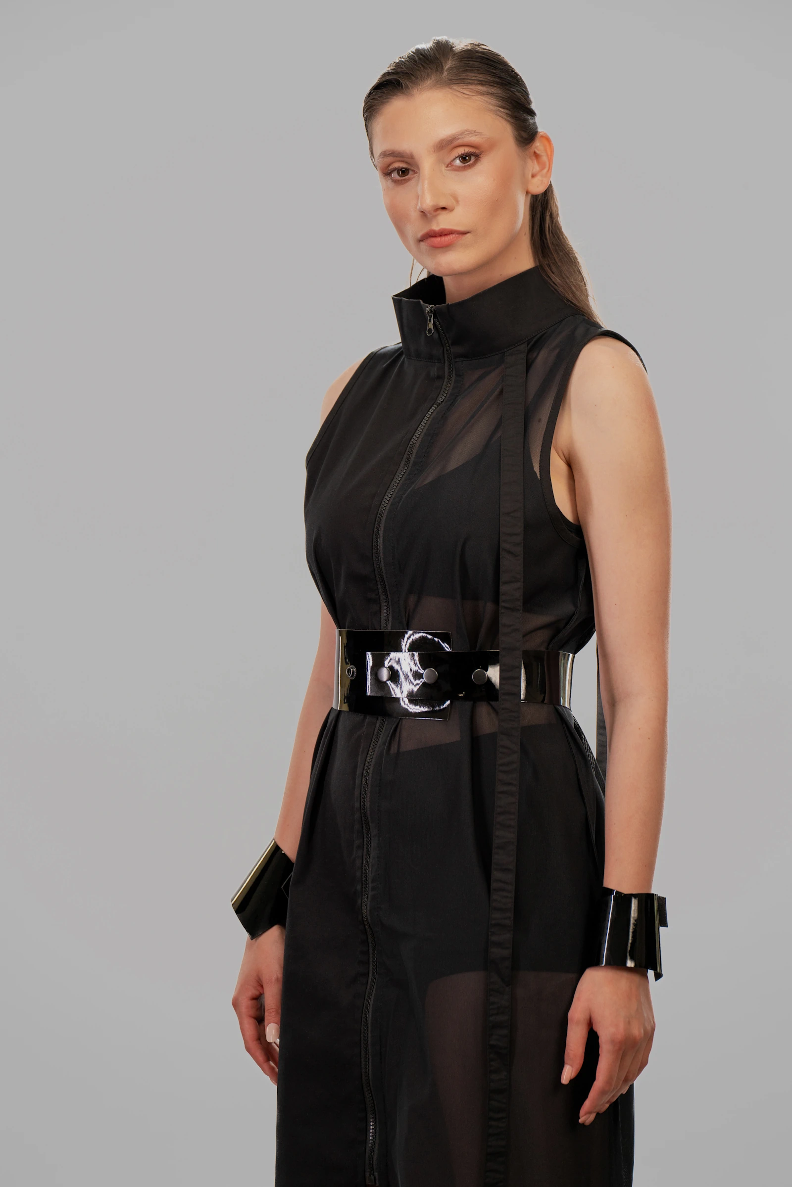 The CONTRAPUNCT vinyl black belt exemplifies futuristic design principles, featuring an asymmetric silhouette crafted from black vinyl. The structured design is secured with snap button closures, combining bold aesthetics with functionality. Consistent with the brand’s design philosophy, the CONTRAPUNCT branding label is prominently placed on the exterior of the garment, ensuring visibility and reinforcing the brand’s signature style. The composition and size labels are attached to the branding label and can be easily removed.